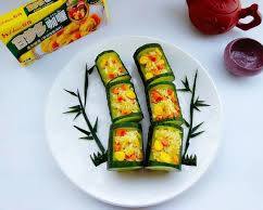 6-黃瓜切成差不多小段,為了擺放平穩底部削去一層皮。用小刀將黃瓜中間切空。黃瓜皮切成竹竿和竹葉,擺入餐盤。填入咖哩炒飯,即可開吃。